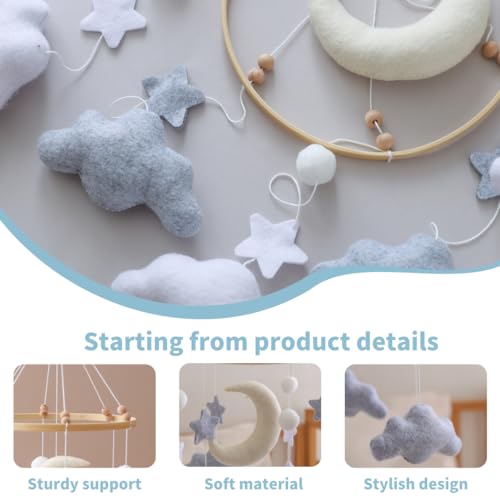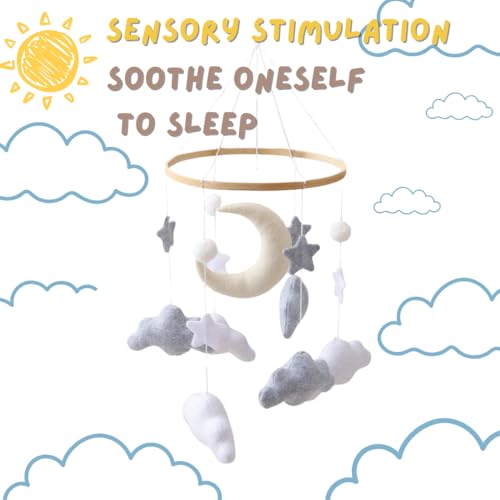Promotes Visual Stimulation and Early Development More than just a decorative piece, this mobile supports your baby’s early visual development. The slow, gentle movement of the felt moon and clouds captures your baby’s attention, encouraging focus and promoting sensory awareness. Its soothing design also helps create a comforting bedtime routine, making this mobile a beautiful and functional addition to your nursery.